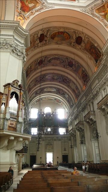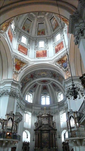 薩爾斯堡大教堂,混合了巴洛克與羅馬的建築樣式;昔日莫札特即在此受洗,自從1920年以來的每年夏天所舉辦的薩爾斯堡音樂節,